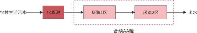 生活污水經(jīng)農(nóng)戶管網(wǎng)收集后首先進入化糞池單元,后流至AA罐分戶污水處理設備內(nèi),從厭氧1區(qū)到厭氧2區(qū)。