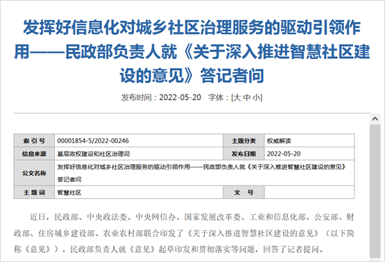 《意見》提出,加強智慧社區(qū)基礎(chǔ)設(shè)施建設(shè)改造。推進(jìn)小區(qū)智能感知設(shè)施建設(shè),擴大智能感知設(shè)施和技術(shù)在生活垃圾處理等領(lǐng)域應(yīng)用。《關(guān)于深入推進(jìn)智慧社區(qū)建設(shè)的意見》全文如下:關(guān)于深入推進(jìn)智慧社區(qū)建設(shè)的意見智慧社區(qū)是充分應(yīng)用大數(shù)據(jù)、云計算、人工智能等信息技術(shù)手段,整合社區(qū)各類服務(wù)資源,打造基于信息化、智能化管理與服務(wù)的社區(qū)治理新形態(tài)。為充分運用現(xiàn)代信息技術(shù),不斷提升城鄉(xiāng)社區(qū)治理服務(wù)智慧化、智能化水平,根據(jù)《中共中央 國務(wù)院關(guān)于加強基層治理體系和治理能力現(xiàn)代化建設(shè)的意見》、《國務(wù)院辦公廳關(guān)于印發(fā)〈“十四五”城鄉(xiāng)社區(qū)服務(wù)體系建設(shè)規(guī)劃〉的通知》等文件要求,現(xiàn)就推進(jìn)智慧社區(qū)建設(shè)提出如下意見:(一)指導(dǎo)思想。以習(xí)近平新時代中國特色社會主義思想為指導(dǎo),深入學(xué)習(xí)貫徹習(xí)近平總書記關(guān)于網(wǎng)絡(luò)強國的重要思想和基層治理的重要論述精神,貫徹落實黨的十九大和十九屆歷次全會精神,立足新發(fā)展階段,完整、準(zhǔn)確、全面貫徹新發(fā)展理念,服務(wù)加快構(gòu)建新發(fā)展格局,深化物聯(lián)網(wǎng)、大數(shù)據(jù)、云計算和人工智能等信息技術(shù)應(yīng)用,按照智慧城市和現(xiàn)代社區(qū)的發(fā)展要求,依托社區(qū)數(shù)字化平臺和線下社區(qū)服務(wù)機構(gòu),集約建設(shè)便民惠民智慧服務(wù)圈,提供線上線下相融合的社區(qū)生活服務(wù)、社區(qū)治理及公共服務(wù)、智能小區(qū)等服務(wù),讓社區(qū)更加和諧有序、服務(wù)更有溫度,不斷增強居民獲得感、幸福感、安全感。——堅持黨的全面領(lǐng)導(dǎo)。把堅持和加強黨的全面領(lǐng)導(dǎo)貫穿于智慧社區(qū)建設(shè)的全過程和各方面,確保智慧社區(qū)建設(shè)的正確方向。——堅持以人民為中心。始終把滿足人民對美好生活的向往作為出發(fā)點和落腳點,拓展應(yīng)用服務(wù)場景,讓數(shù)據(jù)多跑路、群眾少跑腿。——堅持統(tǒng)籌規(guī)劃。強化系統(tǒng)觀念,整合現(xiàn)有資源,推動系統(tǒng)集成、數(shù)據(jù)共享和業(yè)務(wù)協(xié)同,打破信息壁壘,為基層賦能減負(fù)。——堅持需求導(dǎo)向。立足社區(qū)資源稟賦和居民需求,強化系統(tǒng)建設(shè)的實用性、前瞻性和可擴展性,突出以城帶鄉(xiāng)、急用先行、梯次推進(jìn)、迭代更新。——堅持安全發(fā)展。加強智慧社區(qū)網(wǎng)絡(luò)和數(shù)據(jù)安全管理,強化關(guān)鍵信息基礎(chǔ)設(shè)施防護(hù),依法保護(hù)居民信息安全和個人隱私。(三)建設(shè)目標(biāo)。到2025年,基本構(gòu)建起網(wǎng)格化管理、精細(xì)化服務(wù)、信息化支撐、開放共享的智慧社區(qū)服務(wù)平臺,初步打造成智慧共享、和睦共治的新型數(shù)字社區(qū),社區(qū)治理和服務(wù)智能化水平顯著提高,更好感知社會態(tài)勢、暢通溝通渠道、輔助決策施政、方便群眾辦事。(一)集約建設(shè)智慧社區(qū)平臺。充分依托已有平臺,因地制宜推進(jìn)智慧社區(qū)綜合信息平臺建設(shè),推動部署在不同層級、不同部門的各類社區(qū)信息系統(tǒng)與智慧社區(qū)綜合信息平臺聯(lián)網(wǎng)對接或向其遷移集成。依法向社區(qū)下放政務(wù)服務(wù)審批受理權(quán)限,擴大社區(qū)政務(wù)服務(wù)事項網(wǎng)上受理、辦理數(shù)量和種類,拓展政務(wù)事項查詢、辦理、反饋功能。完善電子政務(wù)服務(wù)流程,實行“前臺一口受理、后臺分工協(xié)同”運行模式,推動跨部門業(yè)務(wù)協(xié)同、信息實時共享。以設(shè)區(qū)的市為單位,大幅度優(yōu)化精簡部署在社區(qū)的業(yè)務(wù)應(yīng)用系統(tǒng),整合功能相對單一、相近或重復(fù)的辦公類、管理類、學(xué)習(xí)類等APP,整治“指尖上的形式主義”。推進(jìn)智慧社區(qū)綜合信息平臺與城市運行管理服務(wù)平臺、智慧物業(yè)管理服務(wù)平臺、智能家庭終端互聯(lián)互通和融合應(yīng)用,提供一體化管理和服務(wù)。(二)拓展智慧社區(qū)治理場景。依托智慧社區(qū)綜合信息平臺建立健全民情反饋、風(fēng)險研判、應(yīng)急響應(yīng)、輿情應(yīng)對機制,提升社區(qū)全周期管理水平。全面推進(jìn)“互聯(lián)網(wǎng)+社區(qū)黨建”,推動社區(qū)黨建工作和黨員管理服務(wù)信息化,做好網(wǎng)上群眾工作。優(yōu)化社區(qū)網(wǎng)格管理平臺,推行“社區(qū)輸入+網(wǎng)上推送+部門響應(yīng)”工作模式,健全即時響應(yīng)機制及時回應(yīng)群眾訴求。搭建社區(qū)災(zāi)害風(fēng)險預(yù)警模型,發(fā)展實時監(jiān)測、智能預(yù)警、應(yīng)急管理和疫情防控智能應(yīng)用,全面提升社區(qū)預(yù)警和應(yīng)急處置能力。加強網(wǎng)絡(luò)文明建設(shè),更好滿足人民群眾日益增長的精神文化需求,增進(jìn)居民對社區(qū)生活共同體的歸屬感。探索推進(jìn)村(居)民委員會換屆網(wǎng)上選民登記、社區(qū)協(xié)商、村(居)務(wù)公開、民主監(jiān)督等,暢通群