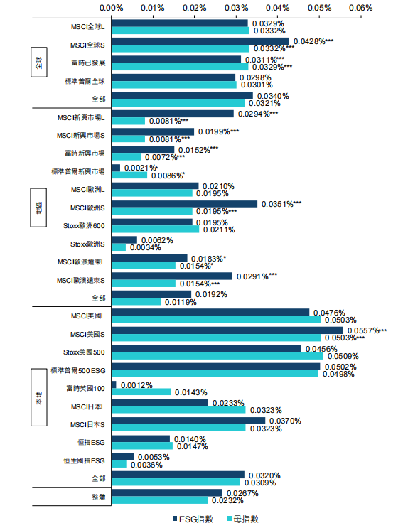 圖3.各代表性 ESG指數(shù)與其母指數(shù)的平均每日回報(bào)率(2010年7月-2020年6月)