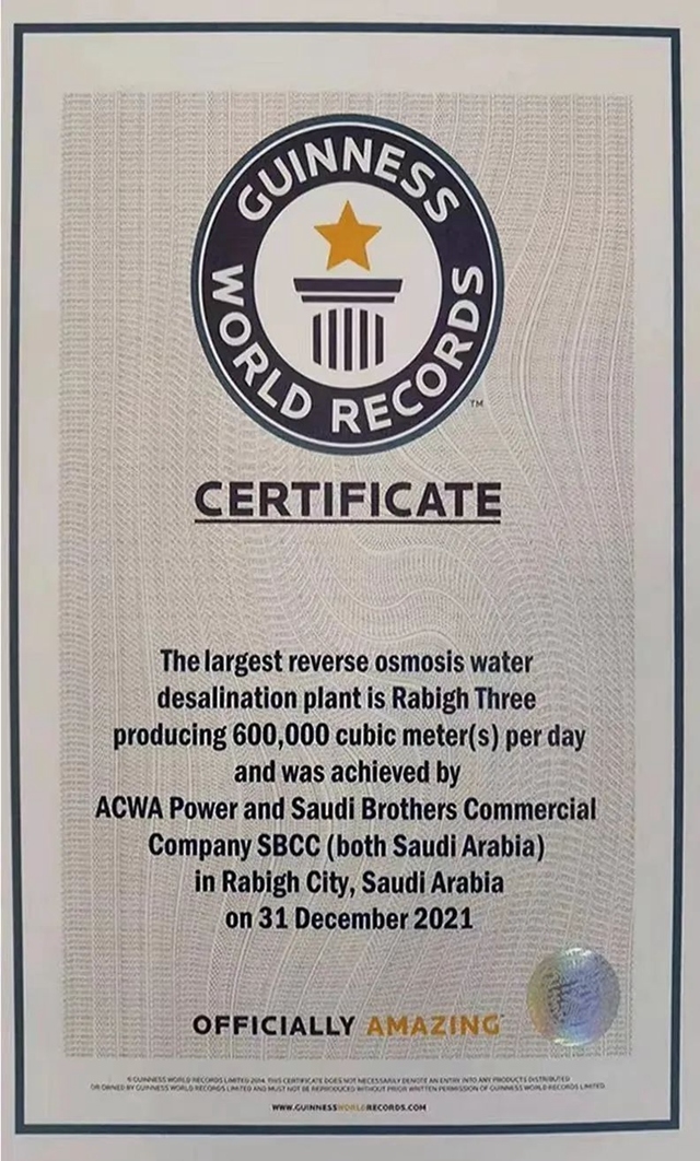 該項目位于沙特拉比格市,于去年12月,提前合同工期2個月投產。采用先進的反滲透技術,日產水量60萬立方米,每天可向吉達、麥加等沙特主要城市200多萬戶居民和朝圣者提供基本生活用水,甘甜的淡水不僅滋養(yǎng)了穆斯林圣地,還促進了社會和旅游業(yè)發(fā)展。就在前不久,它還收到吉尼斯世界紀錄證書,成為世界最大單體反滲透海水淡化項目。
