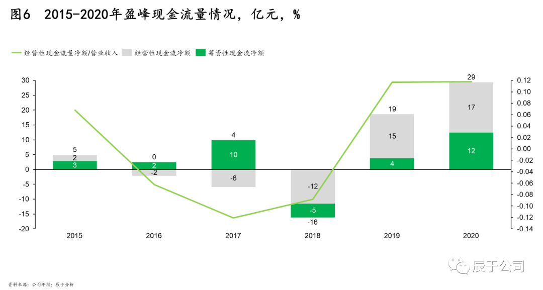 快速調整的“有進有退”策略不僅讓盈峰環(huán)境的主業(yè)更加突出,也改善了盈峰環(huán)境的經營性現金流狀況,近兩年經營性現金流及其與營收的比值扭虧為盈,增長顯著(見圖5、圖6)。