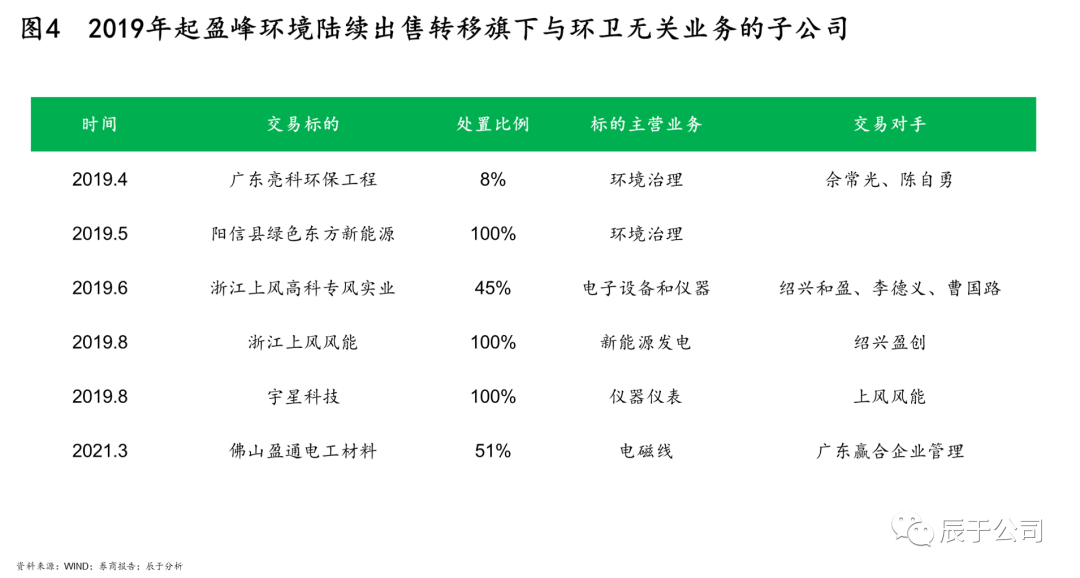 另一方面果斷剝離非環(huán)衛(wèi)相關業(yè)務。2019年起,盈峰環(huán)境陸續(xù)出售轉移旗下與環(huán)衛(wèi)無關業(yè)務的子公司,剝離的主要對象為低利潤或者邊緣業(yè)務,如電磁線業(yè)務利潤率低,風機與環(huán)境治理業(yè)務市場占有率低,行業(yè)地位低,都不利于公司主業(yè)競爭力的提升;剝離的主要方式為剝離公司而非業(yè)務,以環(huán)境監(jiān)測業(yè)務為例,雖然宇星科技被剝離,但是雙方明確五年內,乙方、標的公司及宇星科技不得從事環(huán)境監(jiān)測業(yè)務,宇星科技相關無形資產授權盈峰使用,不影響公司相關業(yè)務繼續(xù)拓展(見圖4)。