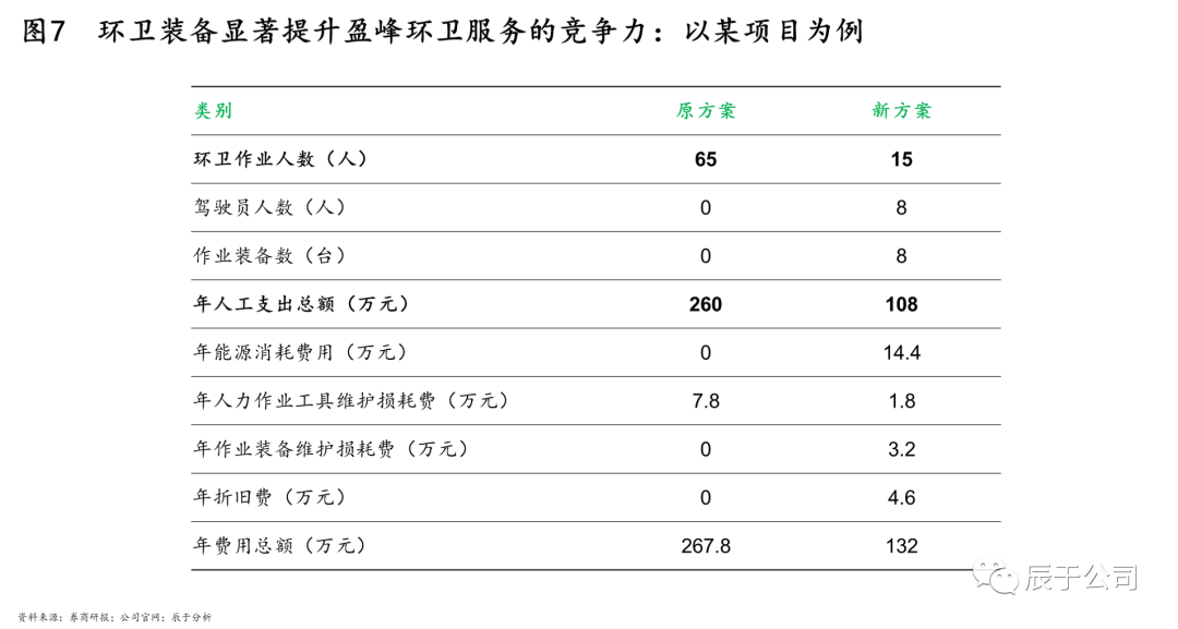一方面,通過自有環(huán)衛(wèi)裝備優(yōu)勢強化環(huán)衛(wèi)服務拿單能力。以某項目為例,傳統環(huán)衛(wèi)項目方案年費用總額為267.8萬元,相比之下,盈峰涉及的機械化新方案僅為132萬元,年度總費用投入消減50.7%,作業(yè)人員隊伍精簡64.6%(見圖7)。