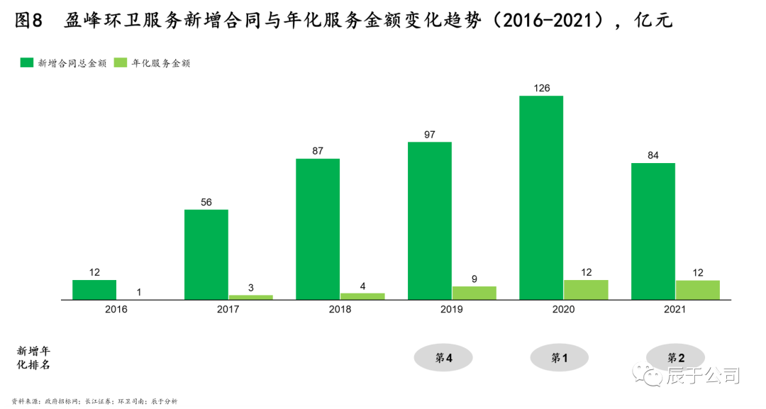 上述“裝備帶動服務”的業(yè)務協同戰(zhàn)略成效顯著,盈峰接連斬獲多個大型環(huán)衛(wèi)項目,如78億的深圳市寶安區(qū)環(huán)衛(wèi)一體化PPP項目、10.3億的淮北市環(huán)衛(wèi)一體化特許經營項目等。憑著“拿大單”“拿明星項目”,盈峰的環(huán)衛(wèi)服務業(yè)務發(fā)展迅速,近年來在環(huán)衛(wèi)業(yè)務市場的地位也有了顯著提升(見圖8)。增量來看,2020年,盈峰環(huán)境環(huán)衛(wèi)服務新增合同總額、新增年化合同額均位列全國前列;存量來看,截至2021年,盈峰環(huán)境運營的環(huán)衛(wèi)服務項目累計合同總額達到459億,待執(zhí)行合同總額達383億,位居行業(yè)前三,可持續(xù)經營能力名列前茅。