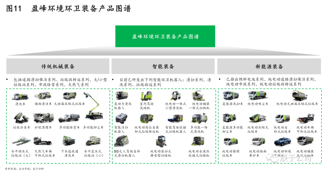 以此為基,盈峰環(huán)境進一步聚焦機械化、智慧化、新能源化三大方向,構建了完整的環(huán)衛(wèi)裝備圖譜,涵蓋傳統機械裝備、智能裝備以及新能源裝備等三大領域(見圖11)。