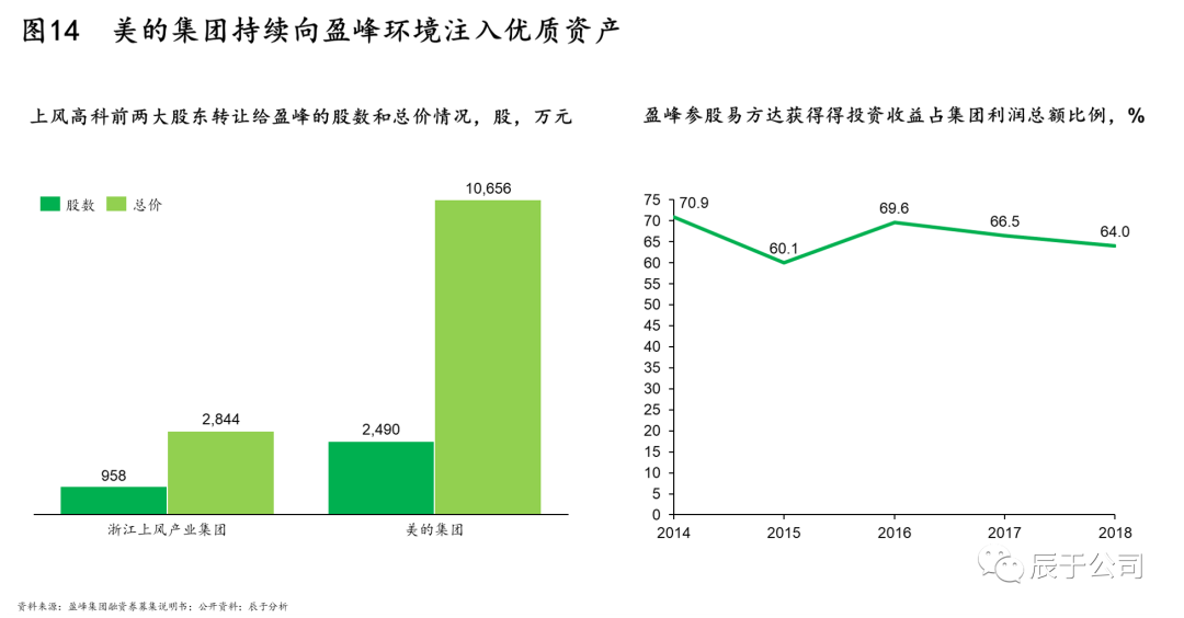 三是資本運作方面。美的集團持續(xù)多年向盈峰環(huán)境注入旗下優(yōu)質資產,為盈峰早期的規(guī)模擴張?zhí)峁┝舜罅χС帧H?006年2月,上風高科前兩大股東浙江上風產業(yè)集團及美的集團將其各自持有公司的法人股轉讓給盈峰集團,從每股價格來看,在入主兩年多后,美的集團僅僅按原價轉讓,并沒取得投資收益,可謂原價轉手;而對于盈峰而言,這是其體系內的首家上市公司,為公司未來發(fā)展發(fā)揮了至關重要的作用。又如2007年4月,美的以1.65億元的價格向盈峰集團轉讓易方達基金25%股權,易方達成為盈峰金融板塊的主要成員,自此,盈峰從易方達獲得的投資收益多年來占到公司利潤總額的60%以上(見圖14)。