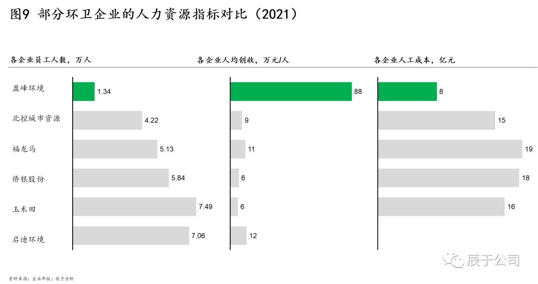 此外,這一模式也讓盈峰環(huán)境跳出了“環(huán)衛(wèi)企業(yè)=人多、人均創(chuàng)收低、技術含量低”的傳統環(huán)衛(wèi)企業(yè)形象。眾所周知,傳統環(huán)衛(wèi)屬勞動密集產業(yè),企業(yè)多以人員投入多、人均創(chuàng)收低、技術投入低等模式運營,機械化程度不足。而盈峰憑借裝備領域積累的技術優(yōu)勢,在包括兩大深圳項目在內的眾多項目運營中,應用了自主研發(fā)的全球首批智能小型環(huán)衛(wèi)機器人編隊,大大提升項目機械化率,也使項目的人均產值顯著攀升(見圖9)。