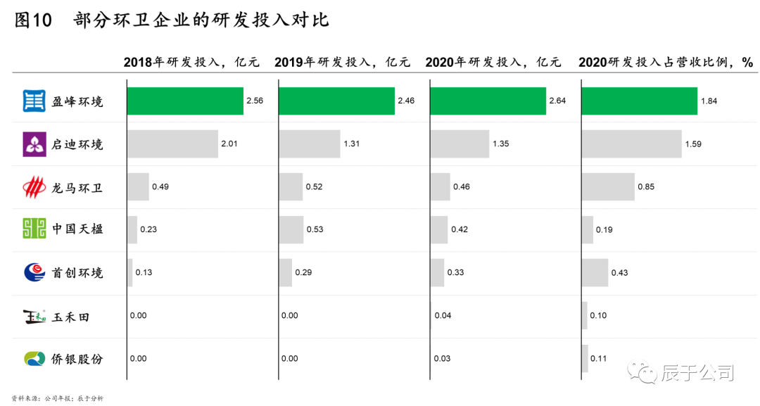 相比其他競爭對手,盈峰環(huán)境在研發(fā)上的投入明顯更大,2018-2020年的研發(fā)投入絕對值一直遙遙領先其他企業(yè),研發(fā)投入占營收比例也明顯更高(見圖10)。