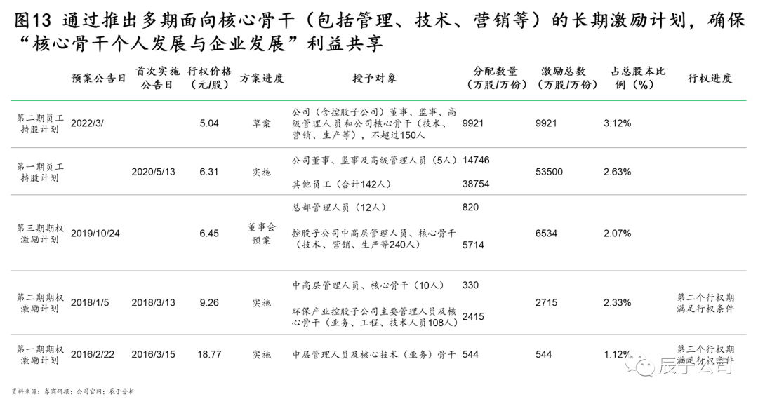 二是政策機制支持方面。盈峰環(huán)境引入美的經驗,通過推出多期面向核心骨干(包括管理、技術、營銷等)的長期激勵計劃,確?!昂诵墓歉蓚€人發(fā)展與企業(yè)發(fā)展”利益共享(見圖13)。