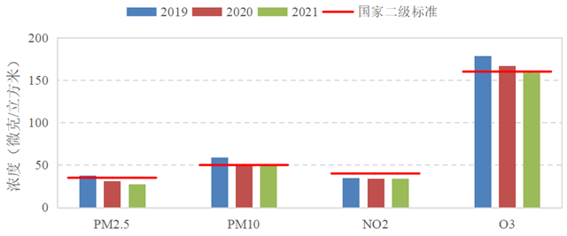 PM2.5、SO2、CO、O3評(píng)價(jià)指標(biāo)逐年改善,2021年P(guān)M2.5、SO2、CO 、O3年均濃度較 2020 年分別下降 9.7%、14.3%、9.1%、4.8%,較2019年分別下降26.3%、25.0%、9.1%、11.2%。2021年P(guān)M10、NO2年均濃度與2020年持平,較2019年分別下降15.3%、2.9%。