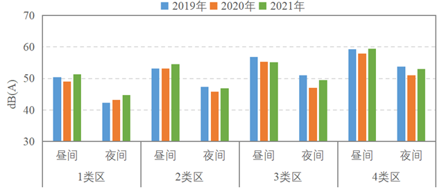 2021年,示范區(qū)各類聲環(huán)境功能區(qū)監(jiān)測(cè)均值均達(dá)到相應(yīng)的聲環(huán)境質(zhì)量標(biāo)準(zhǔn)。2019~2021年示范區(qū)各類聲環(huán)境功能區(qū)監(jiān)測(cè)均值總體基本持平。