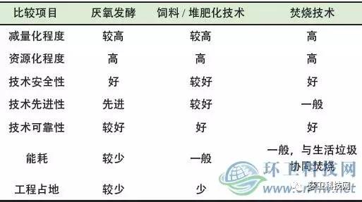 目前餐廚垃圾主要處理技術(shù)有填埋、焚燒、厭氧消化、飼料/堆肥化等。考慮到餐廚垃圾廢棄物的特點(diǎn),填埋術(shù)的適應(yīng)性均相對(duì)較差。因此針對(duì)厭氧消化、飼料化、焚燒技術(shù)進(jìn)行比較,結(jié)果見表1。