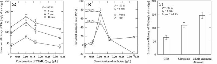 圖2 不同影響因素的提取效率。(a)不同的脈沖超聲時間下PSs的提取量與CTAB濃度之間的關(guān)系;(b)CTAB和SDS的添加濃度與表面活性劑強(qiáng)化比之間的關(guān)系;(c)三種方法下剩余污泥中高分子物質(zhì)的提取量(來自原文)