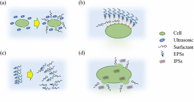 圖3 表面活性劑強(qiáng)化超聲波法提取的四種機(jī)理。(a)降低表面張力;(b)破壞EPSs與細(xì)胞體間的非共價鍵;(c)相似相溶作用;(d)破壞細(xì)胞壁或細(xì)胞膜結(jié)構(gòu)(來自原文)
