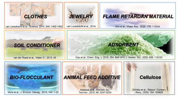 污水資源化是未來污水處理的發(fā)展方向,也是人類可持續(xù)發(fā)展的必然。自污水或污泥中提取的多糖、蛋白質(zhì)、腐殖質(zhì)、核酸、DNA、磷脂、糖醛酸和礦物質(zhì)等,可作為印染原料、首飾和服裝原料、阻燃材料、土壤調(diào)節(jié)劑、吸附劑、生物絮凝劑、飼料添加劑,應(yīng)用于水處理、農(nóng)業(yè)、園藝、造紙工業(yè)、醫(yī)療、建筑工業(yè)等領(lǐng)域,具有重大的回收價值。