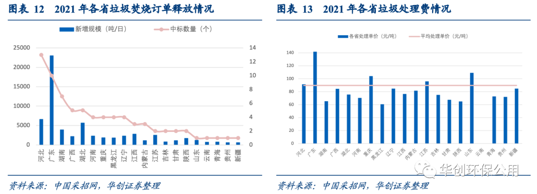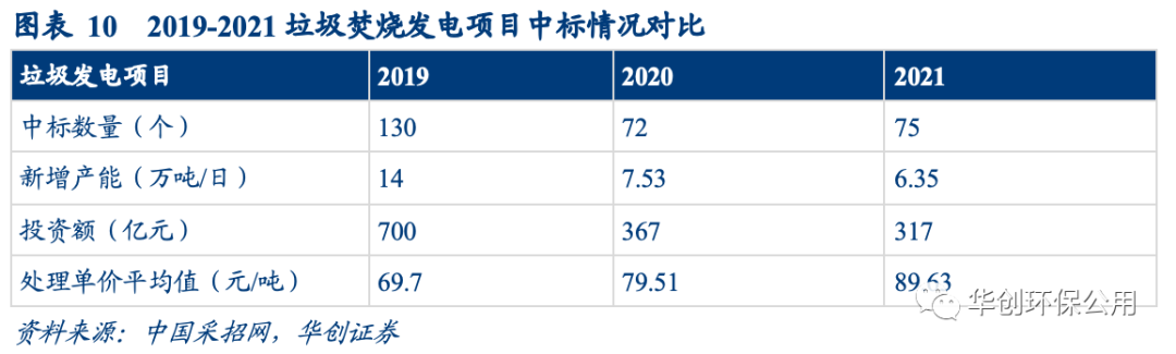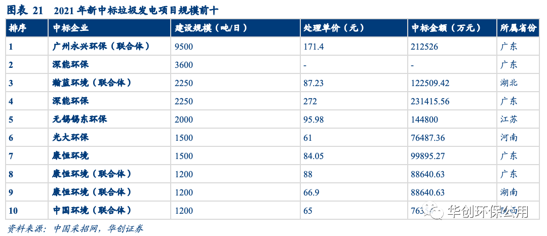 垃圾焚燒新訂單釋放速度減緩、處理費(fèi)價(jià)格提升。2021年垃圾焚燒新增體量進(jìn)一步下降,全年中標(biāo)項(xiàng)目總處理規(guī)模達(dá)6.35萬噸/日,同比2020年下降15.67%。與此同時(shí),2021年平均中標(biāo)處理單價(jià)為89.63元/噸,同比2020 年增長(zhǎng)12.73%。近三年以來中標(biāo)價(jià)一直維持快速上升態(tài)勢(shì),疊加政策推動(dòng),我們認(rèn)為未來很可能按照“產(chǎn)生者付費(fèi)”原則,實(shí)施居民處理費(fèi),健全收費(fèi)機(jī)制,垃圾處理費(fèi)單價(jià)有望進(jìn)一步提升,降低對(duì)補(bǔ)貼依賴程度。