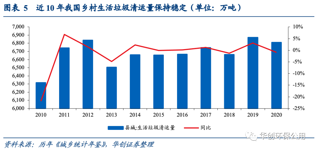 根據(jù)《2020城鄉(xiāng)建設(shè)統(tǒng)計(jì)年鑒》,農(nóng)村地區(qū)現(xiàn)每年產(chǎn)生垃圾總量穩(wěn)定在6600萬噸以上,人均垃圾產(chǎn)生量穩(wěn)定處于0.3千克/天的水平。相比城市而言,農(nóng)村的垃圾產(chǎn)生規(guī)模和人均垃圾產(chǎn)生量遠(yuǎn)遠(yuǎn)偏低,雖然存在鄉(xiāng)村人口萎縮的情況,但由于農(nóng)村地區(qū)垃圾收集、處置率存在較大的提高空間,依靠對(duì)未處理的垃圾存量的消化和擴(kuò)大處理覆蓋,未來農(nóng)村垃圾處理規(guī)模的擴(kuò)張可期。