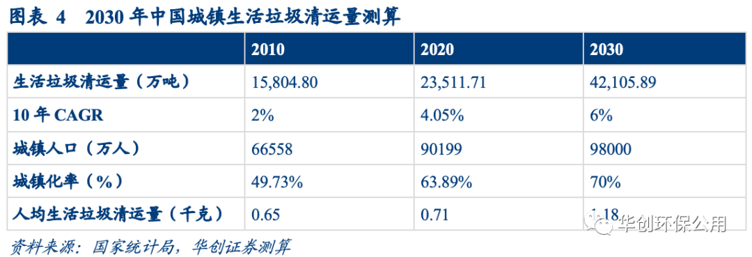 中國(guó)未來城市生活垃圾產(chǎn)生量仍存在較大上升空間。根據(jù)中國(guó)社會(huì)科學(xué)院農(nóng)村發(fā)展研究所、中國(guó)社會(huì)科學(xué)出版社聯(lián)合發(fā)布《城市藍(lán)皮書:中國(guó)城市發(fā)展報(bào)告No.12》,預(yù)計(jì)到2030年,中國(guó)城鎮(zhèn)化率將達(dá)到70%。按照2030年城鎮(zhèn)化率達(dá)到70%、城鎮(zhèn)人均1.18千克/天的垃圾產(chǎn)生量計(jì)算,中國(guó)的城鎮(zhèn)垃圾量將達(dá)到4.21億噸/年。若按未來城鎮(zhèn)化率達(dá)到80%、城鎮(zhèn)人均1.18千克/天的垃圾產(chǎn)生量計(jì)算,未來中國(guó)城鎮(zhèn)垃圾量將達(dá)到4.91億噸/年。
