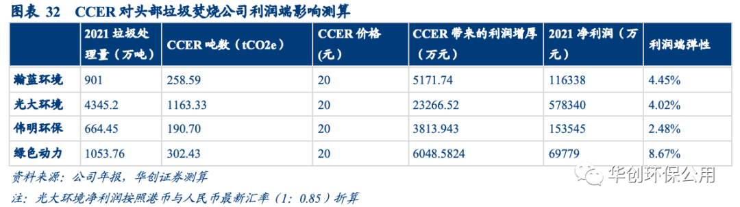 最理想情況下,CCER收入在利潤(rùn)端可為垃圾焚燒頭部企業(yè)帶來3%-9%的增厚。我們選取瀚藍(lán)環(huán)境、光大環(huán)境、偉明環(huán)保和綠色動(dòng)力四家頭部垃圾焚燒上市公司進(jìn)行測(cè)算,在假設(shè)公司所處理的垃圾全部可以轉(zhuǎn)化為CCER的情況下,按照2021年的垃圾處理量和凈利潤(rùn),CCER收入可分別為瀚藍(lán)環(huán)境、光大環(huán)境、偉明環(huán)保、綠色動(dòng)力帶來4.45%/4.02%/2.48%/8.67的利潤(rùn)端彈性。