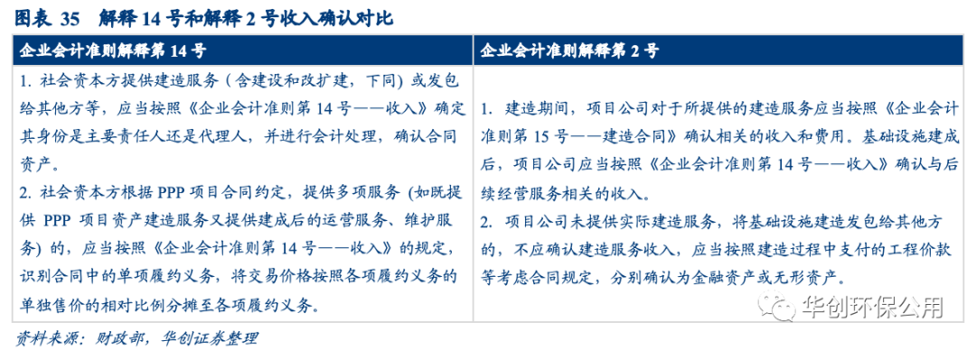 環(huán)保行業(yè)中很多項(xiàng)目的業(yè)主都是地方政府,所以項(xiàng)目大多采用PPP、BOT模式。2021年1月26日,財(cái)政部印發(fā)《企業(yè)會(huì)計(jì)準(zhǔn)則解釋第14號(hào)》,規(guī)范了企業(yè)對(duì)政府和企業(yè)合作(PPP)項(xiàng)目合同的會(huì)計(jì)處理,并完全取代了《解釋2號(hào)》中BOT項(xiàng)目會(huì)計(jì)處理方法。該會(huì)計(jì)政策變更的影響已體現(xiàn)在環(huán)保上市公司發(fā)布的2021年報(bào)之中。在本周的小專題研究中,我們將以典型環(huán)保上市公司財(cái)報(bào)為基礎(chǔ),剖析該會(huì)計(jì)準(zhǔn)則變更對(duì)資產(chǎn)負(fù)債表、現(xiàn)金流量表和利潤(rùn)表的影響。