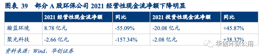 2021年8月,財(cái)政部發(fā)布了11個(gè)政府和社會(huì)資本合作(PPP) 會(huì)計(jì)處理實(shí)施問答,對(duì)PPP項(xiàng)目建造期間發(fā)生的建造支出在現(xiàn)金流量表中應(yīng)如何列示做出進(jìn)一步說明:PPP項(xiàng)目建造期間相關(guān)建造支出作為投資性現(xiàn)金流列示調(diào)整至經(jīng)營(yíng)性現(xiàn)金流列示。我們認(rèn)為該會(huì)計(jì)準(zhǔn)則的變更是2021年部分環(huán)保上市公司經(jīng)營(yíng)性現(xiàn)金流下滑的原因之一。