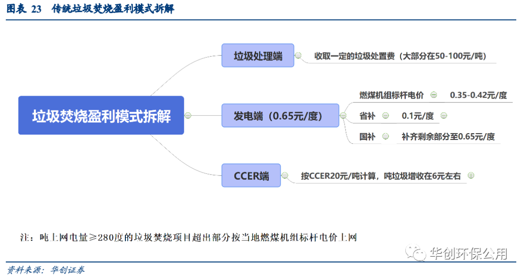 按照傳統(tǒng)盈利模式拆解,噸垃圾上網(wǎng)電量和垃圾處理費(fèi)是影響垃圾焚燒發(fā)電運(yùn)營(yíng)收入的主要因素。理想情況下,垃圾焚燒發(fā)電的商業(yè)模式優(yōu)質(zhì)清晰,處理費(fèi)主要和項(xiàng)目所在地政府的財(cái)政支付能力有關(guān),而噸垃圾上網(wǎng)電量則與公司的技術(shù)手段和垃圾熱值有關(guān)。但近兩年行業(yè)內(nèi)即出現(xiàn)了如國(guó)補(bǔ)退坡這樣的擾動(dòng)因素,也出現(xiàn)了CCER 等利潤(rùn)增厚因素,此部分我們將詳細(xì)剖析各類新變化對(duì)盈利因子的擾動(dòng)情況。