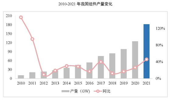 盡管受到供應(yīng)鏈價(jià)格波動(dòng)、外部環(huán)境復(fù)雜嚴(yán)峻和不確定性增多等不利因素影響,2021年我國光伏制造端規(guī)模仍保持迅速擴(kuò)大態(tài)勢。2021年,我國多晶硅產(chǎn)量達(dá)50.6萬噸,同比增長27.8%,硅片產(chǎn)量約為226.6GW,同比增長40.4%。電池片產(chǎn)量為197.9GW,同比增長46.8%,增幅最大。組件產(chǎn)量為181.8GW,同比增長45.9%。