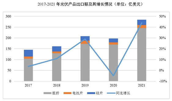 2021年我國光伏產(chǎn)品出口總額約284.3億美元,同比增長43.9%。其中硅片出口額24.5億美元,出口量約22.6GW,電池片出口額13.7億美元,出口量約10.3GW。在全球能源轉(zhuǎn)型、綠色低碳轉(zhuǎn)型大勢所趨,海外光伏市場需求不斷增長的大背景下,組件出口額246.1億美元,同比增長44.8%,出口量約98.5GW,同比增長25%。組件出口額和出口量均創(chuàng)歷史新高。在多晶硅進(jìn)口方面,2021年我國太陽能級多晶硅進(jìn)口額約18.7億美元,同比增長108.2%,進(jìn)口量約11萬噸,同比增長11.1%。