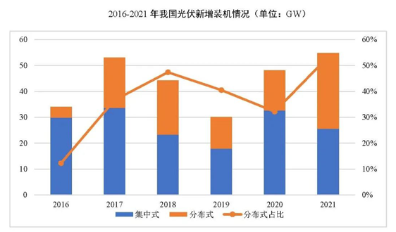 2021年,我國光伏新增裝機(jī)量、分布式裝機(jī)量、戶用裝機(jī)量以及分布式裝機(jī)在總裝機(jī)量中的占比均創(chuàng)歷史新高。我國光伏新增裝機(jī)54.88GW,同比增長13.9%,其中,分布式裝機(jī)約29.28GW,占全部新增裝機(jī)的53.4%,歷史上首次突破50%。2021年戶用裝機(jī)達(dá)21.6GW,同比增長113.3%,占2021年我國新增光伏裝機(jī)的39.4%。光伏發(fā)電量3259億千瓦時(shí),同比增長25.1%,全國利用小時(shí)數(shù)1163小時(shí),同比增加3小時(shí),光伏發(fā)電利用率98%,與上年基本持平,新疆、西藏等地光伏消納水平顯著提升,光伏利用率同比分別提升2.8%和5.6%。