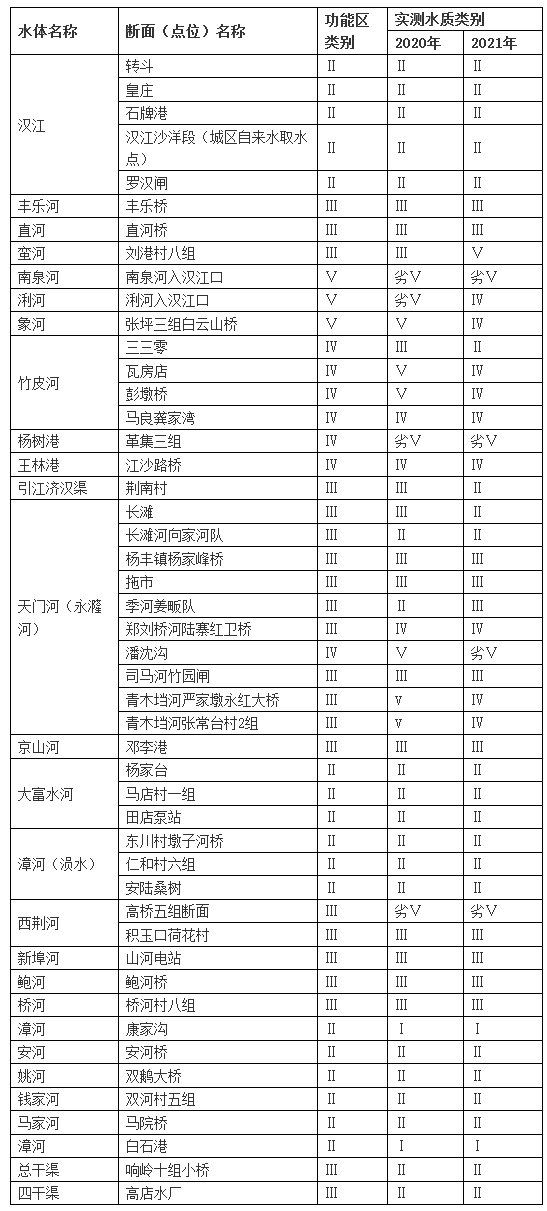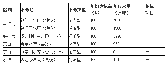 我市縣級(jí)以上集中式飲用水源地有6個(gè),分別為:市二水廠、市三水廠、漢江鐘祥皇莊段、惠亭水庫(kù)、八字門水庫(kù)(備用水源地)和漢江沙洋段。根據(jù)2021年監(jiān)測(cè)結(jié)果顯示,全市縣級(jí)以上集中式飲用水源地水質(zhì)達(dá)標(biāo)率為100 %。(具體達(dá)標(biāo)情況見(jiàn)表7)
