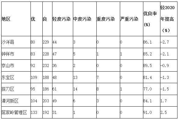 2021年度,荊門中心城區(qū)空氣質(zhì)量?jī)?yōu)良天數(shù)共297天,優(yōu)良天數(shù)所占比例為81.4%。詳細(xì)情況見(jiàn)表1。