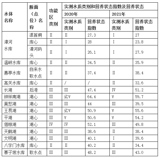 2021年16個(gè)湖庫(kù)監(jiān)測(cè)斷面中,Ⅰ~Ⅲ類水質(zhì)斷面12個(gè),占75%;Ⅳ類水質(zhì)斷面1個(gè),占6.25%;Ⅴ類水質(zhì)斷面3個(gè),占18.75%。具體水質(zhì)類別見(jiàn)表6。