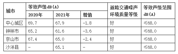 表9 2021年荊門市道路交通晝間噪聲強(qiáng)度等級(jí)表