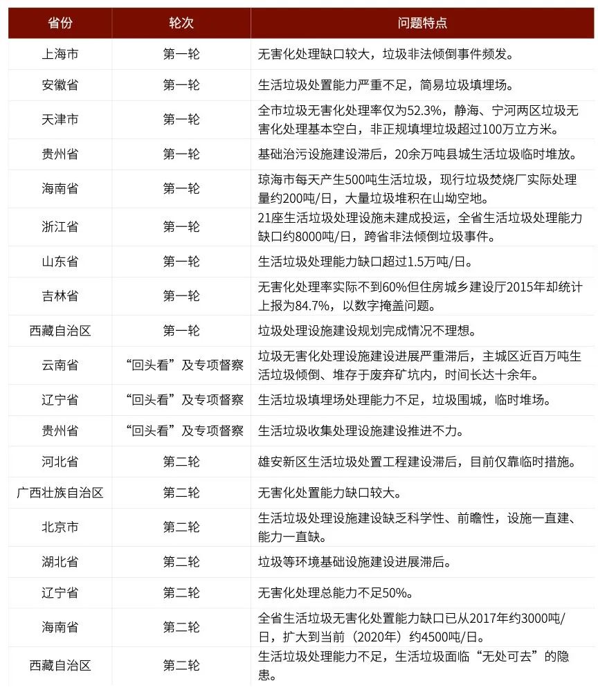 個(gè)別省區(qū)市歷史上無(wú)害化處理率低、無(wú)害化處理能力不足問(wèn)題嚴(yán)重。其中,山東省在第一輪例行督察中被中央環(huán)保督察組反饋“生活垃圾處理能力缺口超過(guò)1.5萬(wàn)噸/日”、云南省在“回頭看”及專項(xiàng)督察中被反饋“垃圾無(wú)害化處理設(shè)施建設(shè)進(jìn)展嚴(yán)重滯后,主城區(qū)近百萬(wàn)噸生活垃圾傾倒、堆存于廢棄礦坑內(nèi),時(shí)間長(zhǎng)達(dá)十余年”、北京市第二輪例行督察被反饋“生活垃圾處理設(shè)施建設(shè)缺乏科學(xué)性、前瞻性,設(shè)施一直建、能力一直缺”等。具體情況詳見(jiàn)表1。