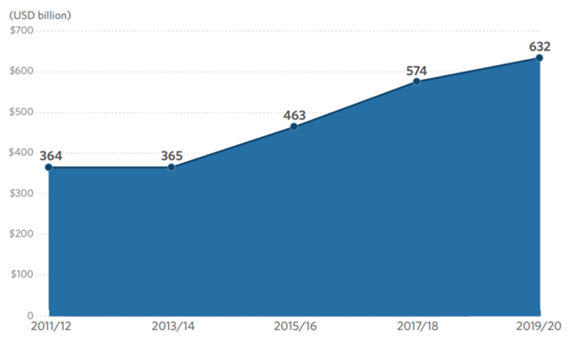 家庭支出是年度私人氣候融資的第三大份額,在2019/2020年增加到550億美元。其中,家庭在電動汽車的年度消費(fèi)支出為250億美元,比2017/2018年減少50億美元,這一減少主要是由于企業(yè)改進(jìn)了其購置電動汽車的相關(guān)統(tǒng)計數(shù)據(jù)。其次,小型太陽能電池板的部署達(dá)到250億美元,主要由美國和中國驅(qū)動。