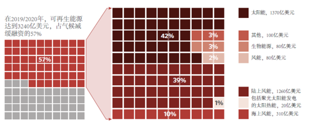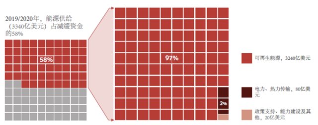 2019-2020年,90%可溯源的氣候投融資用于減緩氣候變化,平均每年達(dá)到5710億美元,比2017-2018年增加了340億美元左右。如下圖所示,減緩資金中,對于能源供給的投資是主要組成部分(3340億美元,58%),同時也占全部氣候融資資金的53%。盡管新冠肺炎疫情對全球經(jīng)濟(jì)產(chǎn)生了影響,但年平均與2017/2018年相比,2019/2020年的可再生能源投資保持穩(wěn)定,在全部能源融資資金中占比97%。值得注意的是,由于太陽能和風(fēng)能技術(shù)的成本大幅降低,同樣的投資水平可以轉(zhuǎn)化為比2017/2018年更大的新增產(chǎn)能。