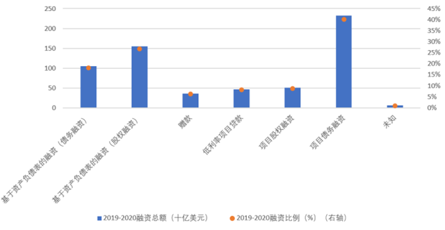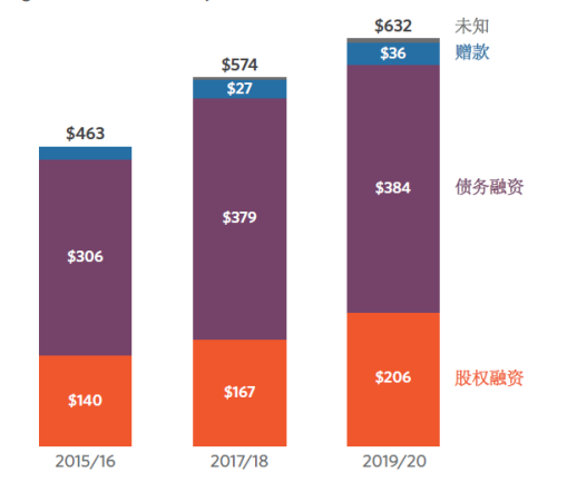 通常情況下,按照融資類型進(jìn)行劃分,氣候融資工具主要包括債務(wù)融資工具、股權(quán)融資工具以及贈款,在2019/2020年度占?xì)夂蛉谫Y總量的比例分別為61%、33%及6%。