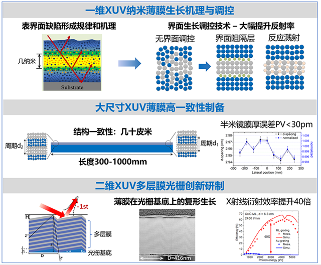 極紫外與X射線(XUV)光學(xué)技術(shù)對前沿科學(xué)問題解決、國防裝備進(jìn)步、高新技術(shù)產(chǎn)業(yè)發(fā)展有重大支撐作用。XUV薄膜器件是其光學(xué)系統(tǒng)的核心,膜厚僅為幾納米至不足1納米。受納米薄膜界面缺陷形成規(guī)律認(rèn)識和制備技術(shù)的限制,XUV薄膜器件長期存在反射率低、器件尺寸小、衍射效率差三大問題,無法滿足同步輻射光源和強(qiáng)場等離子體診斷等重大科學(xué)工程建設(shè)的需求,亟待創(chuàng)新。