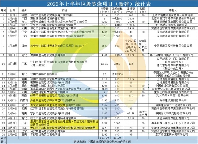 ▼2022年上半年垃圾焚燒項(xiàng)目(新建)統(tǒng)計表(注:標(biāo)黃為焚燒+協(xié)同處置項(xiàng)目,共計6個)