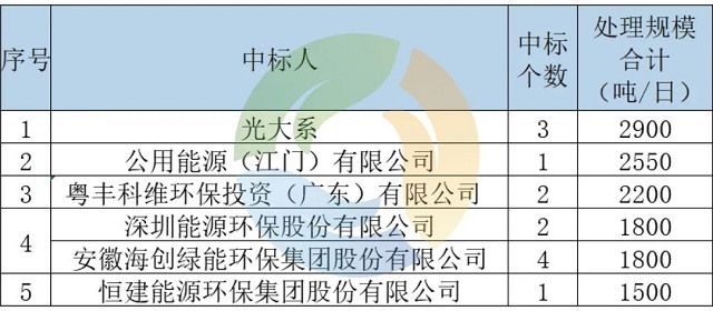 從中標(biāo)企業(yè)上看,26個項(xiàng)目共計17個企業(yè)/集團(tuán)中標(biāo)。按處理規(guī)模統(tǒng)計,前五名企業(yè)排名如下(注:深能環(huán)保和海創(chuàng)綠能并列第四):