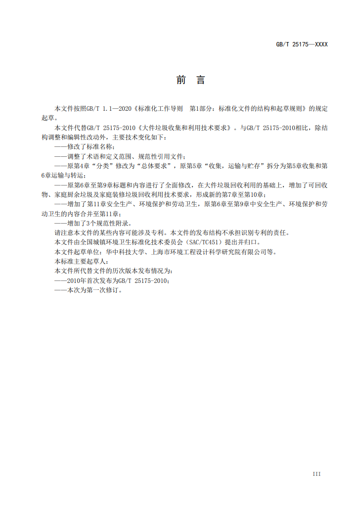 由于標準系由大件垃圾國標修訂而來,因此首先在術語部分進行了修改,對“可回收物”、“家庭廚余垃圾”、“大件垃圾”、“家庭裝修垃圾”、“分揀中心”和“殘余物”六項做出定義。