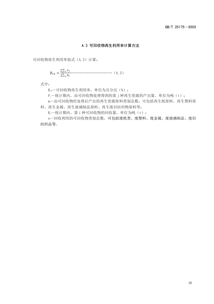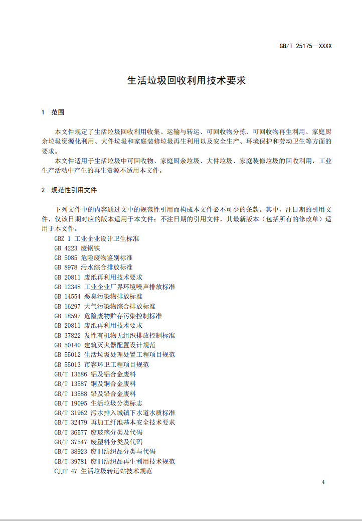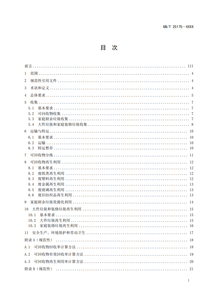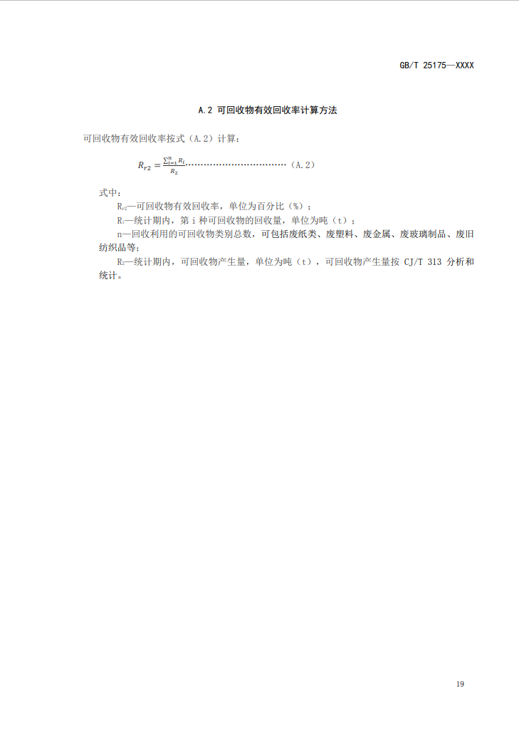 另外標準還對生活垃圾回收利用過程中的安全生產(chǎn)、環(huán)境保護和勞動衛(wèi)生做出了要求,并在附錄中提供了“可回收物回收率計算方法”、“可回收物有效回收率計算方法”、“可回收物再生利用率計算方法”、“家庭廚余垃圾分出率計算方法”、 “家庭廚余垃圾資源化利用率計算方法”。
