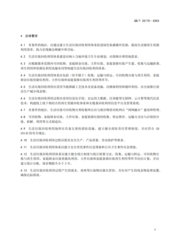4、生活垃圾回收利用體系應包括(但不限于)收集、運輸與轉運、可回收物分揀與再生利用、家庭廚余垃圾資源化利用、大件垃圾和家庭裝修垃圾再生利用等環(huán)節(jié)。