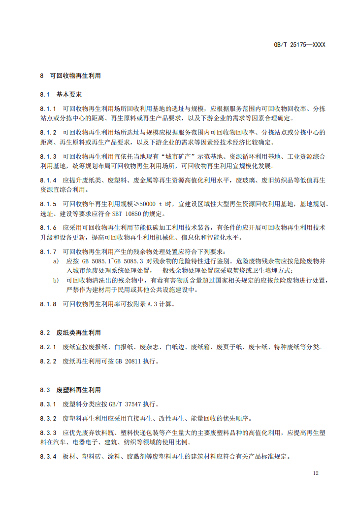 5、可回收物年再生利用規(guī)模≥50000t時,宜建設區(qū)域性大型再生資源回收利用基地,基地規(guī)劃、選址、建設等要求應符合SBT10850的規(guī)定。