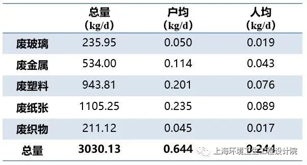 本次調(diào)研有效樣本為168戶家庭。調(diào)研周期內(nèi)共收集可回收物3030.13千克,戶均0.644千克/日,人均0.244千克/日。根據(jù)以上數(shù)據(jù)測算,按2487.0萬常住人口計算(2021年統(tǒng)計數(shù)據(jù)),上海居民家庭產(chǎn)生可回收物總量為6068.28噸/日。