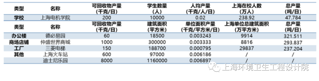 為了解不同類型單位可回收物產(chǎn)量,2020年6月-9月本研究團隊開展了學校、辦公樓、商場店鋪、工廠、交通樞紐、游樂園等6個典型企事業(yè)單位可回收物產(chǎn)量調(diào)研。