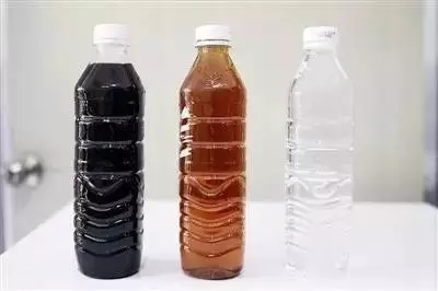 左為進(jìn)水口的垃圾滲濾液,中間一瓶是一級(jí)處理系統(tǒng)中間的一個(gè)環(huán)節(jié)取水,右為經(jīng)過(guò)二級(jí)處理后的出水。