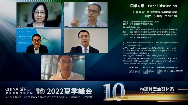 第二輪圓桌對話環(huán)節(jié)圍繞“多措并舉確保高質(zhì)量轉(zhuǎn)型”展開,由中國發(fā)展研究基金會副秘書長俞建拖主持。世界能源理事會亞洲項目總監(jiān)劉小衛(wèi),穆迪ESG解決方案事業(yè)部副總裁、亞太區(qū)可持續(xù)金融業(yè)務(wù)經(jīng)理Jeffrey Sukjoon LEE,CDP全球環(huán)境信息研究中心中國辦公室資本市場業(yè)務(wù)負(fù)責(zé)人朱聆,中國郵政儲蓄銀行總行授信管理部授信政策處(行業(yè)研究處)負(fù)責(zé)人與綠色金融處負(fù)責(zé)人張明哲博士就高質(zhì)量轉(zhuǎn)型背景下,可持續(xù)金融存在的短板及其原因、以及潛在的解決方案展開了熱烈討論。Jeffrey指出,轉(zhuǎn)型金融對推動亞太地區(qū)的可持續(xù)發(fā)展至關(guān)重要。如果所在行業(yè)減排難度大的發(fā)行人希望進(jìn)入可持續(xù)金融市場獲得可持續(xù)融資,他們就需要可信的轉(zhuǎn)型計劃、戰(zhàn)略和指標(biāo)。雖然我們看到企業(yè)在溫室氣體排放的信息披露方面取得了進(jìn)步,但在標(biāo)準(zhǔn)化和覆蓋范圍方面仍有很多工作要做。