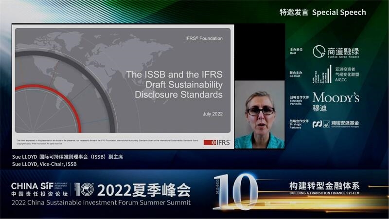 隨后,國際可持續(xù)準(zhǔn)則理事會(ISSB)副主席Sue LLOYD做了特邀發(fā)言。她介紹,ISSB由國際財務(wù)報告準(zhǔn)則(IFRS)基金會在2021年第26屆聯(lián)合國氣候變化大會上發(fā)起,旨在制定統(tǒng)一的可持續(xù)發(fā)展報告準(zhǔn)則。她分享了ISSB近期發(fā)布的兩份可持續(xù)披露準(zhǔn)則文件征求意見稿的主要內(nèi)容,即《國際財務(wù)報告可持續(xù)披露準(zhǔn)則第1號——可持續(xù)相關(guān)財務(wù)信息披露一般要求(征求意見稿)》和《國際財務(wù)報告可持續(xù)披露準(zhǔn)則第2號——氣候相關(guān)披露(征求意見稿)》,并呼吁大家在七月底之前積極提供反饋。
