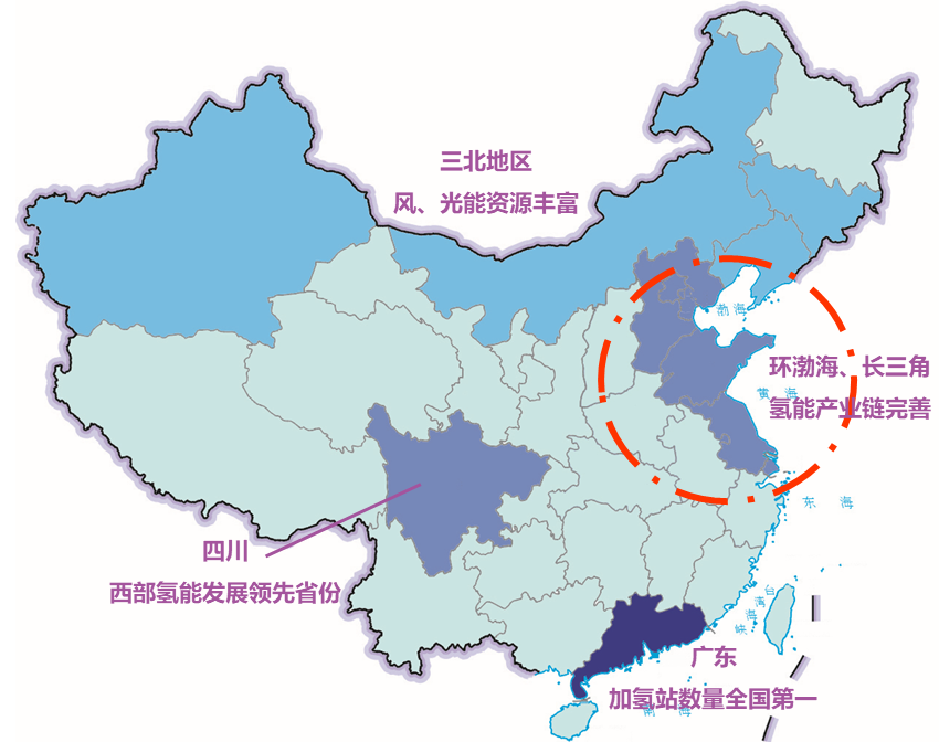 中國目前雖然是世界第一大產(chǎn)氫國,但各地氫能資源配置并不相同:能穩(wěn)定制取綠氫的風、光電在三北地區(qū),水電在西南地區(qū);工業(yè)副產(chǎn)制氫零散遍布;而氫能產(chǎn)業(yè)基地集中在中東南地區(qū)。